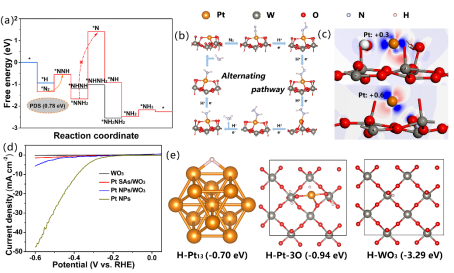 上述原位表征以及DFT理论计算结果表明,Pt SAs/WO3催化氮气还原遵循的是缔合机制中的交替加氢路径,其中贫水区中与W-O多面体上相邻的三个氧原子配位的Pt原子(Pt-3O)为主要的活性位点。负载在WO3基底上的Pt单原子的独特的电子结构使得N2更容易被吸附活化的同时也抑制了HER反应的进行。