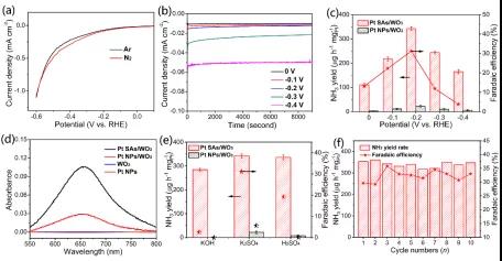 通常,在Pt纳米粒子表面更容易吸附H原子而不是吸附N2。而在NRR过程中,过多的H原子吸附会促进HER过程,与此同时会占据氮气活化的活性位点,极大的抑制了NRR过程。因此,设计和制备Pt基NRR催化剂具有很大的难度。本文通过金属单原子化,电子结构修饰等手段设计制备了一种负载在WO3基底上的Pt单原子催化剂,其显示了优异的电催化氮气还原性能。
