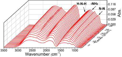 在Pt SAs/WO3电催化氮气还原过程的电化学原位红外光谱中,由于反应过程中水的状态有变化,所以谱线的基线随着反应时间的增加而变化。1457 cm-1 (H-N-H),1295 cm-1 (-NH2)和1071 cm-1 (N-N)表明反应过程中存在N2Hy中间体,证明了催化反应是通过缔合机制进行的。