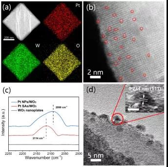 ▲图1 Pt SAs/WO3的SEM (a),HAADF-STEM (b)以及元素分布图(c),(d) Pt NPs/WO3的TEM图