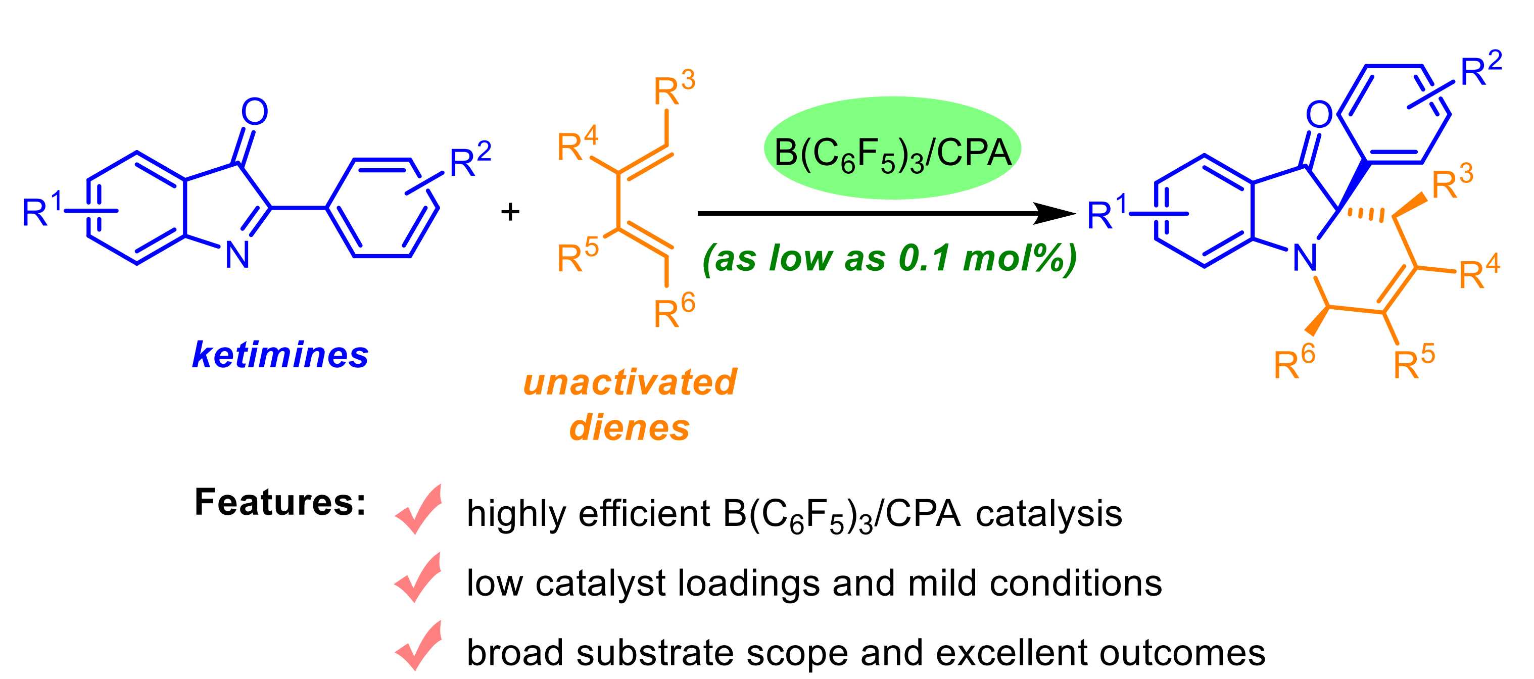 综上所述,李鑫课题组发展了B(C6F5)3/CPA催化的酮亚胺与非活化二烯的不对称氮杂Diels-Alder反应,以高产率与高立体选择性得到了含有季碳手性中心的四氢吡啶化合物。可以预见,这种简单的B(C6F5)3/CPA协同催化体系有望实现更多惰性底物参与的不对称转化。