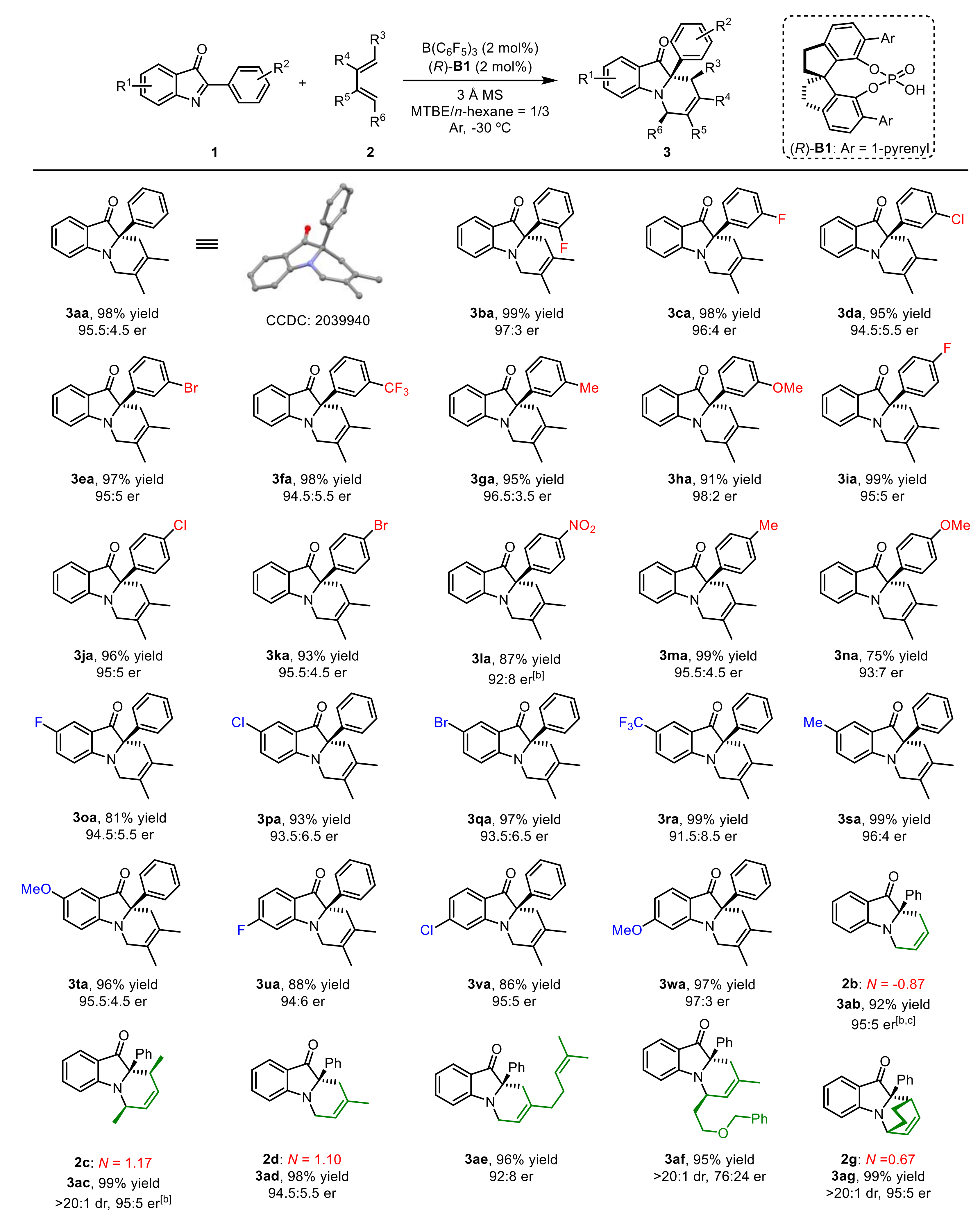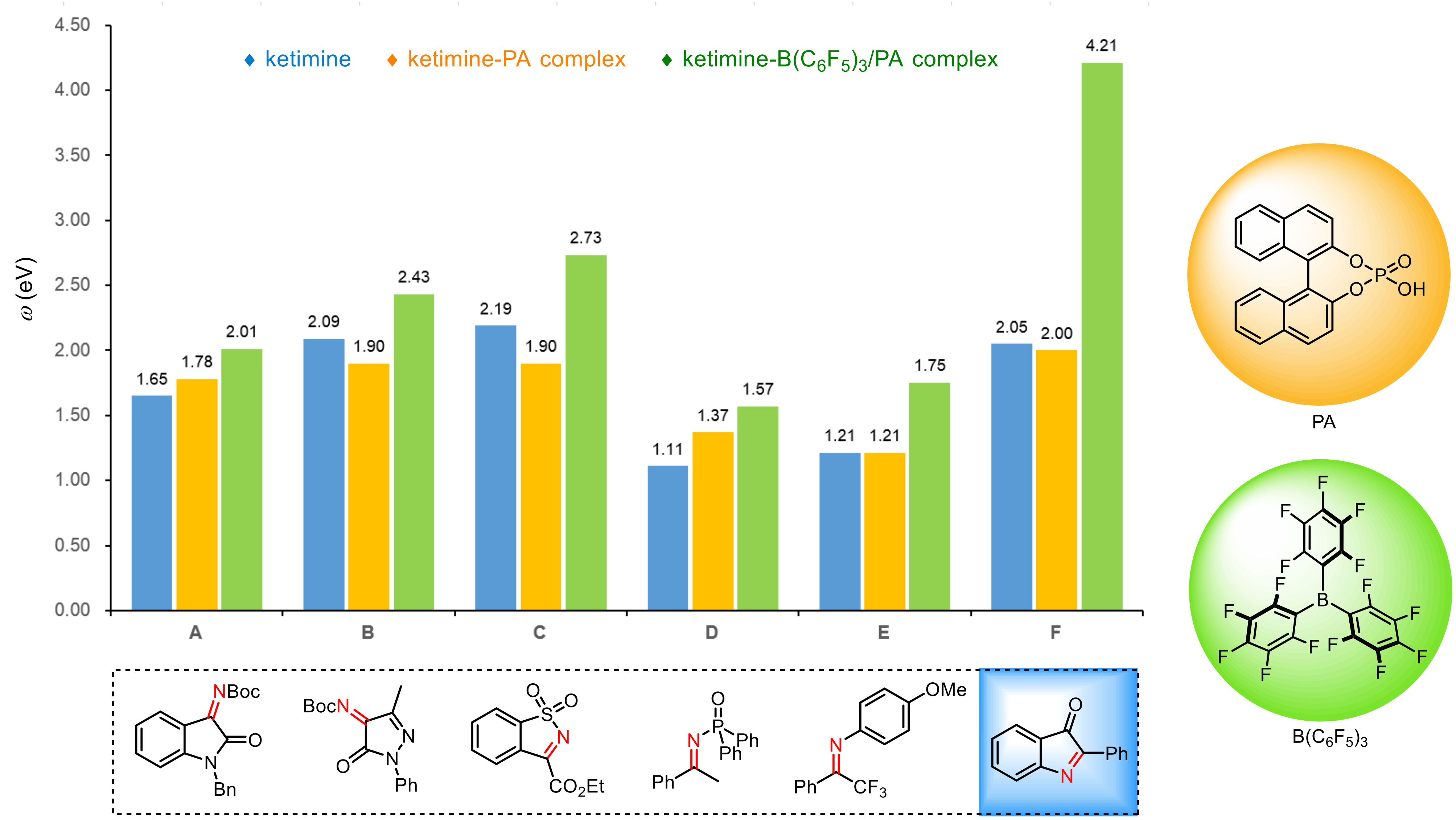 首先,作者对一系列常见的酮亚胺及酮亚胺—催化剂复合物进行了亲电指数(ω)的计算(图3),发现2-苯基-3H-吲哚-3-酮(F)在B(C6F5)3/磷酸(PA)的活化下亲电性增强最为明显,是最合适的候选底物。