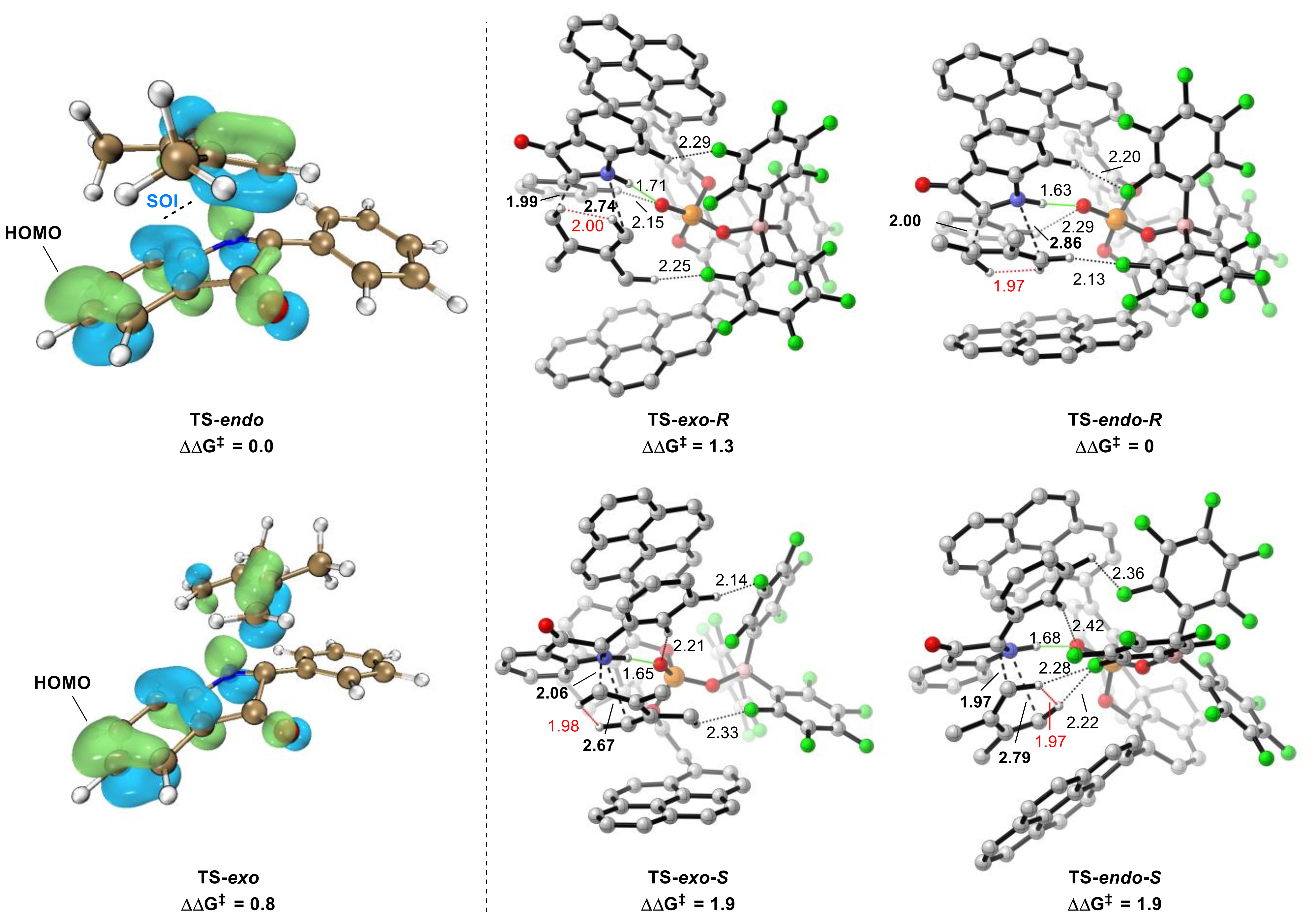 最后,作者对反应机理进行了详细研究,DFT计算表明次级轨道相互作用(SOI)与非共价相互作用(NCI)是产生高立体选择性的原因(图5)。值得注意的是,F原子产生的C-H…F弱相互作用也有助于立体选择性的控制。