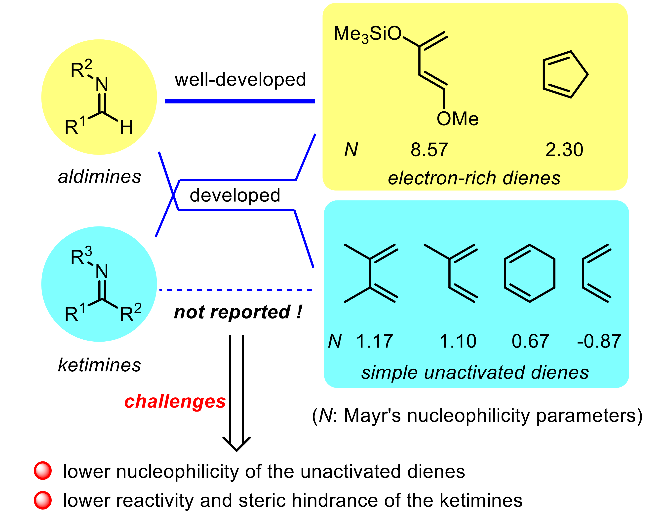 手性四氢吡啶广泛存在于天然产物与生物活性分子中,不对称氮杂Diels-Alder反应则是构筑该类化合物最高效和原子经济性的方法之一。然而,酮亚胺与非活化二烯的不对称氮杂Diels-Alder反应至今还未有报道,仍面临着挑战(图1)。