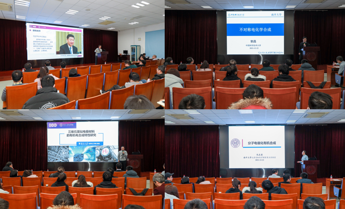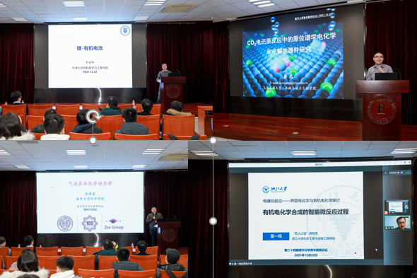 许运华、蒋昆、张新星、莫一鸣、郭昌、程旭、仇友爱七名优秀中青年学者分别就界面电化学及机制研究、锂-有机电池、二氧化碳电还原反应中的原位谱学电化学和电解池器件研究、气液界面化学动力学、有机电化学合成的智能微反应过程、不对称有机电化学合成、三维石墨毡电极材料在多种有机电合成反应中的应用、分子电催化有机合成领域发表了精彩的演讲。学院党委副书记王蔚老师在构建和谐师生关系方面做了精彩的报告。各位报告人分别介绍了各自研究方向的发展现状、研究基础和合作意向,充分展望了界面电化学有有机电化学的应用前景,以及和谐师生关系对科研工作带来的积极影响。