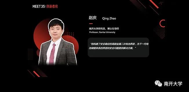 赵庆于2017 年获学院无机化学博士学位,师从陈军院士。后赴美国康奈尔大学从事博士后研究,2021年全职加入学院。主办方表示,他构建了几类安全稳定的高能金属二次电池界面,为下一代电池储能体系的界面和安全问题提供了解决方案。
