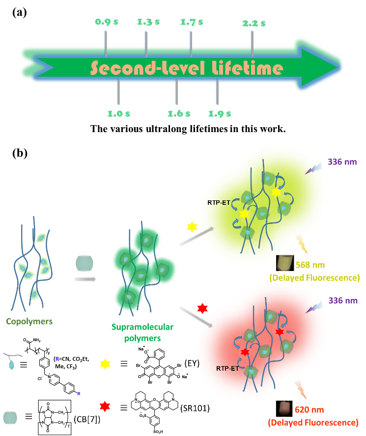 图1. (a) 本文实现的不同秒级磷光寿命;(b)基于超分子聚合物的秒级室温磷光及磷光能量传递示意图
