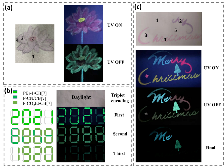 结果表明效果是显著的,不同的超分子聚合物和染料受体(EY和SR101)所构筑的三元超分子体系均能展示出高效的磷光能量传递(效率高达68.9%)和超长延迟荧光发射(图2)。此外,他们还发现,在254 nm光源关闭后,该磷光能量传递体系发出的延迟荧光能明显被肉眼捕捉到,表明该延迟荧光长寿命的特征。更有趣的是,通过改变超分子供体和染料受体的种类以及供受体间的比例,延迟荧光的颜色(EY:黄色,SR101:粉红色)和寿命能够被有效的调控。基于此,该多色延迟发光材料被应用于信息防伪、数字加密、多色发光文案书写等方面,体现了可调控的秒级室温磷光和三元超分子磷光能量传递体系在信息加密、防伪等领域的广泛用途(图3)。