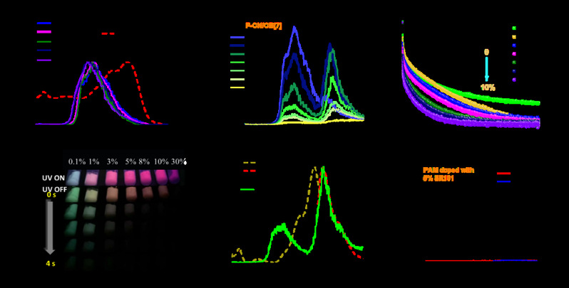 图2. (a)供体受体光谱重叠;加不同比例受体的延时光谱(b)和发光图片(d); (c)加不同比例受体时供体的磷光寿命; (e)掺杂受体在聚丙烯酰胺中的光物理性质; (f) 掺杂受体在聚丙烯酰胺中的延时光谱